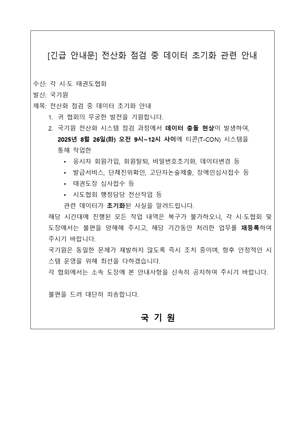 [국기원] (긴급 안내문) 전산화 점검 중 데이터 초기화 관련 안내