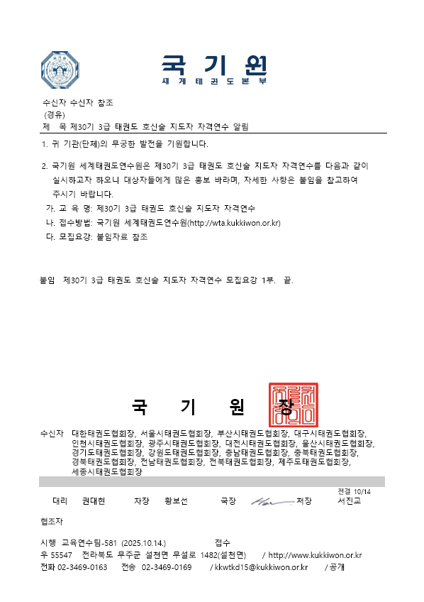 - 제목 [국기원] 제30기 3급 태권도 호신술 지도자 자격연수 알림