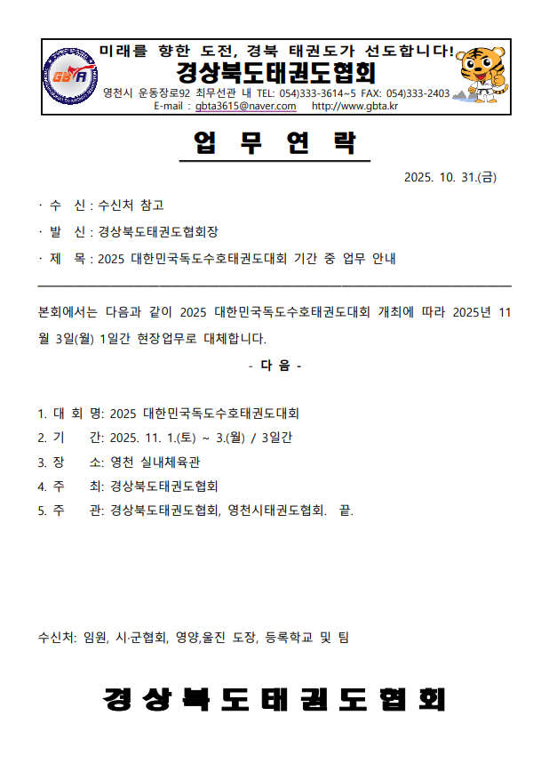 제010호 2025.10_.31 (수신처) 2025 대한민국독도수호태권도대회 기간 중 업무 안내_.pdf