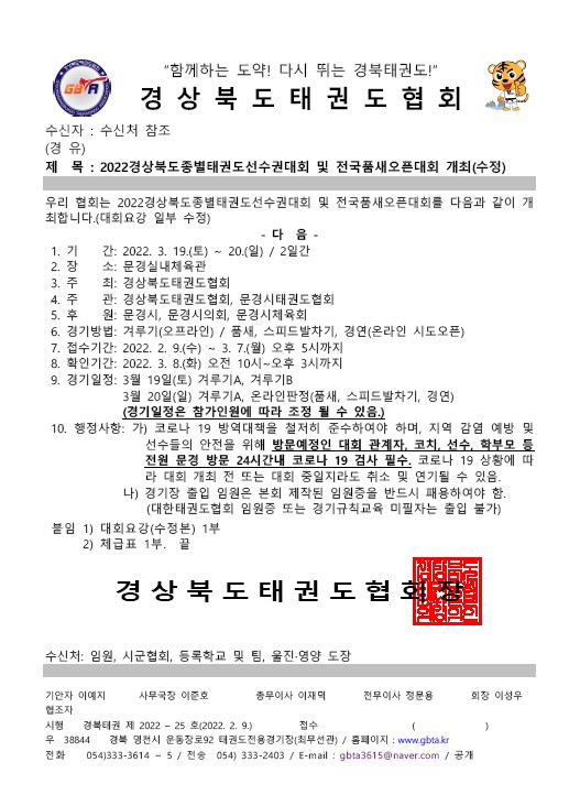 - 제목 [알림] 2022경상북도종별태권도선수권대회 및 전국품새오픈대회 개최(수정)