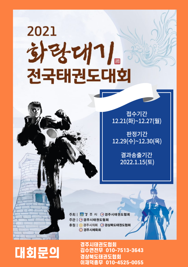 전국 태권도 가족 여러분 !! 안녕하십니까? 경주시태권도협회장 조희락 입니다. 경주에서 2021화랑대기 전국태권도대회를 개최하게 되어 인사드립니다. 1회 대회임에도 불구하고 명실상부한 대회를 만들기 위해 트로피며 메달에도 아주 많은 공을 들였으며, 나아가서 공신력 있는 대회의 시금석이 될 수 있도록 꼼꼼히 준비를 하고 있습니다. 2021화랑대기 전국태권도대회는 경주시와 경주시태권도협회가 공동 주최하고 경북태권도협회.경주시의회.경주시체육회의 후원으로 대회에 참여하시는 지도자와 선수 및 보호자들의 안전에도 만전을 기하겠습니다. 태권도의 성지라 자부하며 새로운 시설확충과 쾌적한 환경으로 조성된 경주동계캠프 운영과 전국대회.국제대회 세계대회를 꾸준히 치루었던 경주시와 경주시태권도협회가 축적된 경험을 바탕으로 이번에도 멋진 대회가 될 수 있도록 최선을 다하겠습니다. 전국에 계신 태권도가족 여러분! 코로나의 역경을 이겨내고 각자의 자리에서 우리 태권도가 체육과 문화의 일번이라는 자긍심으로 힘찬 비상을 함께 하길 열망합니다. 경주 2021화랑대기 전국태권도대회에 많은 태권도가족의 참여를 바라며 인사글 드립니다. |