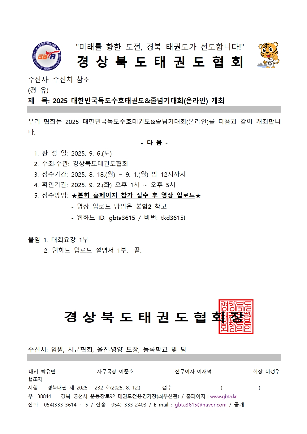 - 제목 [알림] 2025 대한민국독도수호태권도&줄넘기대회(온라인) 개최