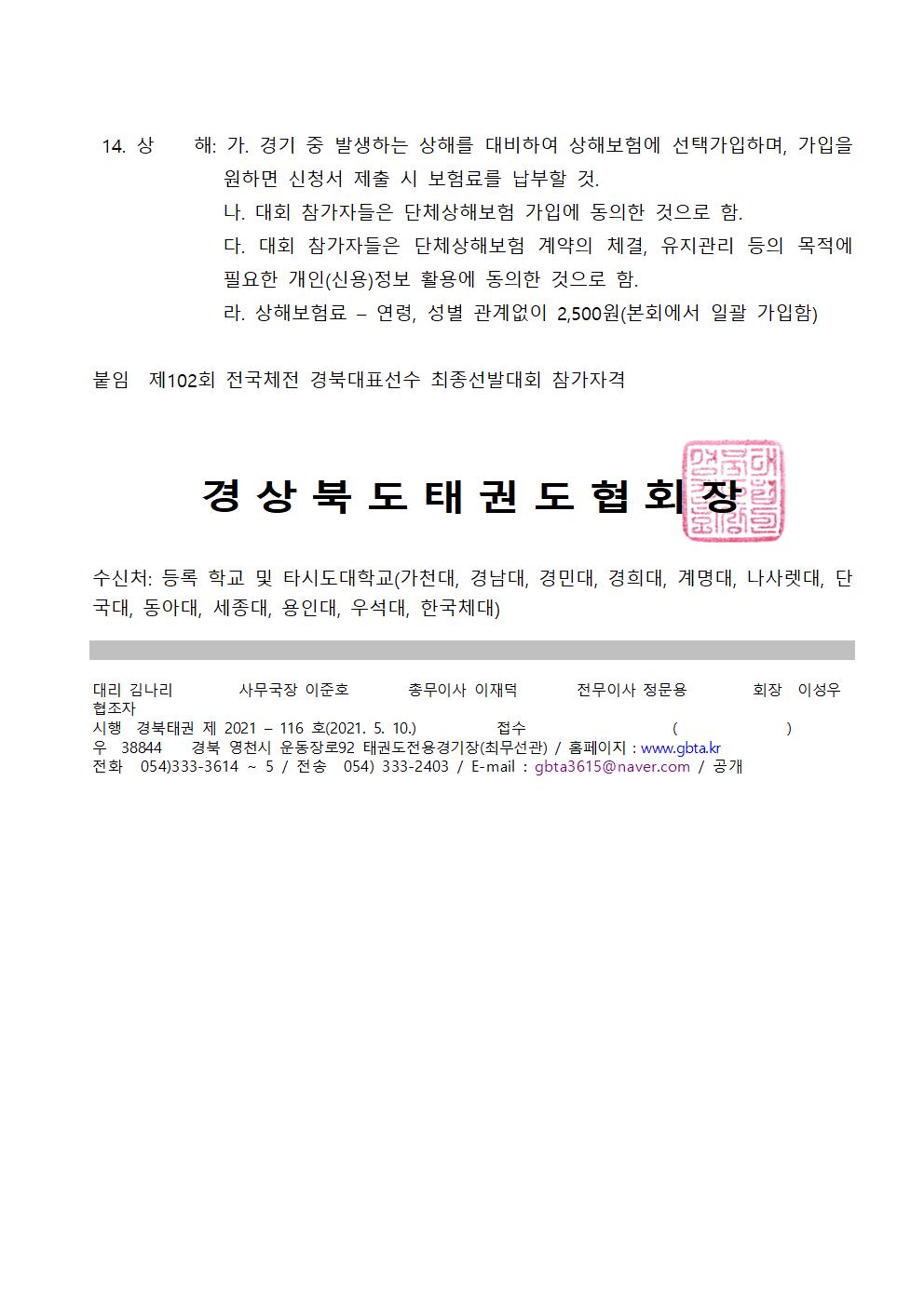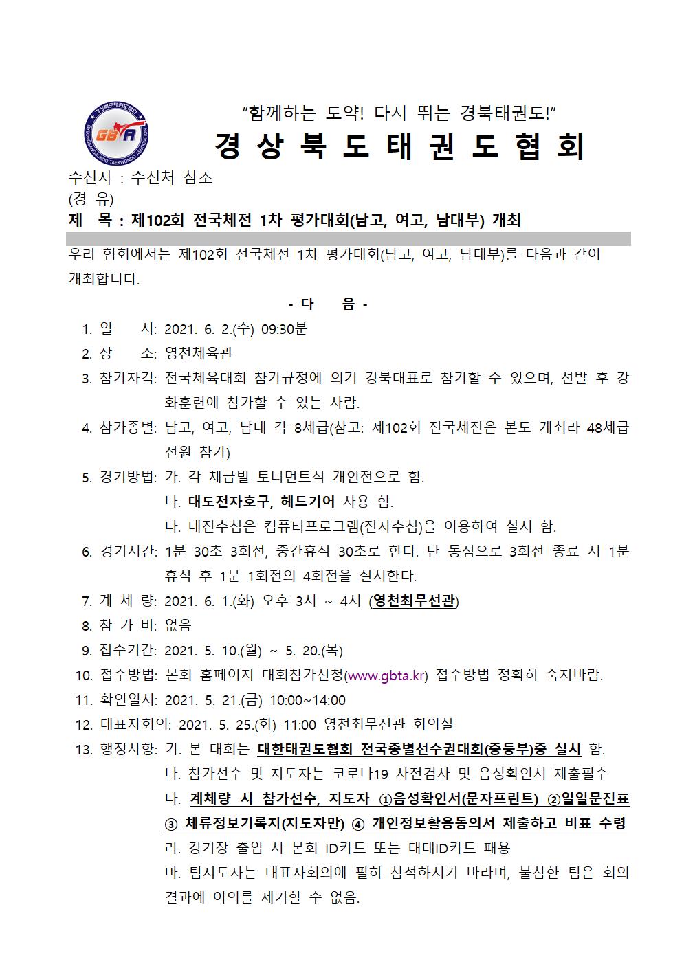 지도자님, 코로나19 음성확인서 및 붙임 서류 1번부터 4번까지 정확히 준비해주시길 부탁드립니다. 보험료 2,500원 납입 계좌 301-0176-0298-71 농협 경북태권도협회 |